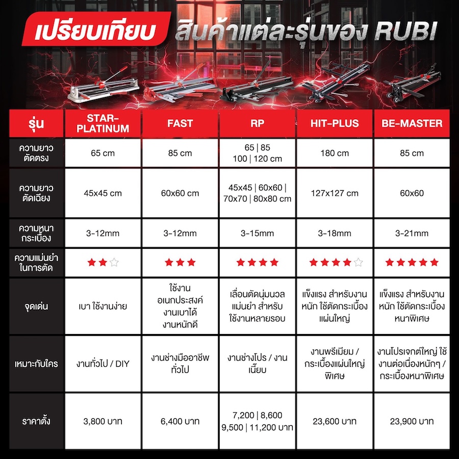 RUBI คือแบรนด์ผู้คิดค้นนวัตกรรมแท่นตัดกระเบื้อง “เครื่องแรกของโลก” เมื่อปี ค.ศ. 1951 (พ.ศ. 2494) ตอนนี้เวลาผ่านมา 70 กว่าปี เรายังคงมุ่งมั่นพัฒนานวัตกรรมและ คุณภาพสินค้าอย่างต่อเนื่อง เราได้ขยายตลาดครอบคลุมกว่า 120 ประเทศทั่วโลก ปัจจุบันนี้เราได้ก้าวเป็นผู้นําในด้านเครื่องตัดกระเบื้องและอุปกรณ์กระเบื้องระดับโลก เรากา รันตีคุณภาพและบริการด้วย “ยอดขายอันดับหนึ่งของโลก” ในกลุ่มแท่นตัดกระเบื้องและ อุปกรณ์ติดตั้งกระเบื้อง