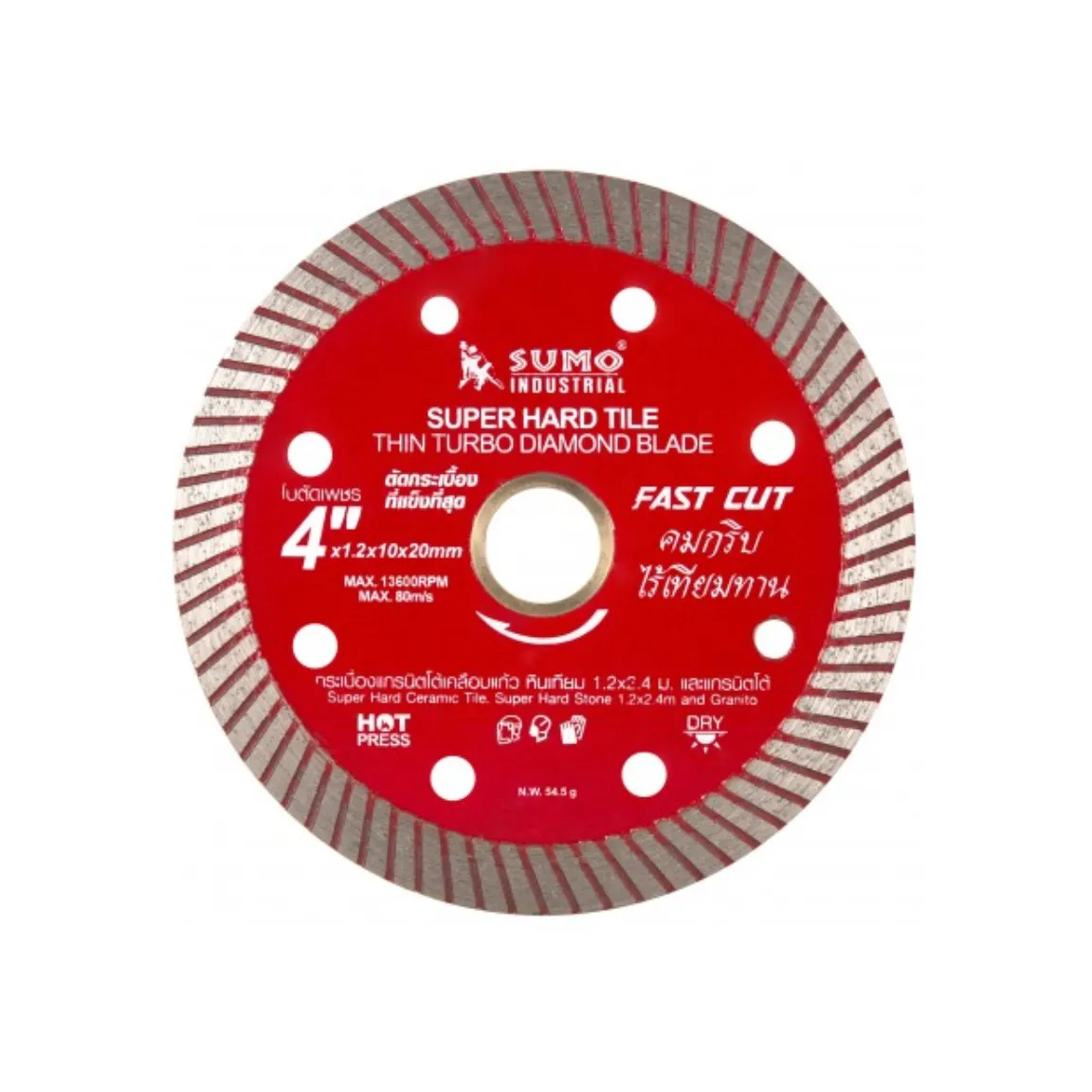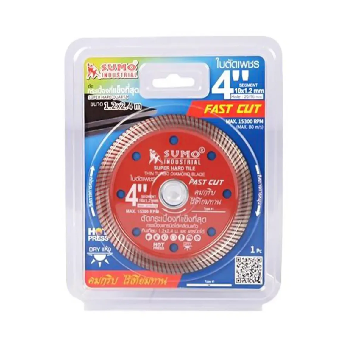 ใบตัดเพชร SUMO Fast Cut ใช้เม็ดเพชรเกรดดีที่สุดจากอเมริกา เป็นใบเพชรตัดกระเบื้องที่คมที่สุดในท้องตลาด ผลิตด้วยกรรมวิธีการกดด้วยความร้อน จึงทำให้ใบตัดเพชรมีความคมทนมากขึ้น สามารถตัดกระเบื้องที่แข็งที่สุดได้อย่างสบาย และตัดกระเบี้องทีเคลือบกระจกบนกระเบื้องได้ง่าย ใช้งานร่วมกับเครื่องเจียรและเครื่องตัดกระเบื้องขนาด 4 นิ้ว ได้อย่างมีประสิทธิภาพ